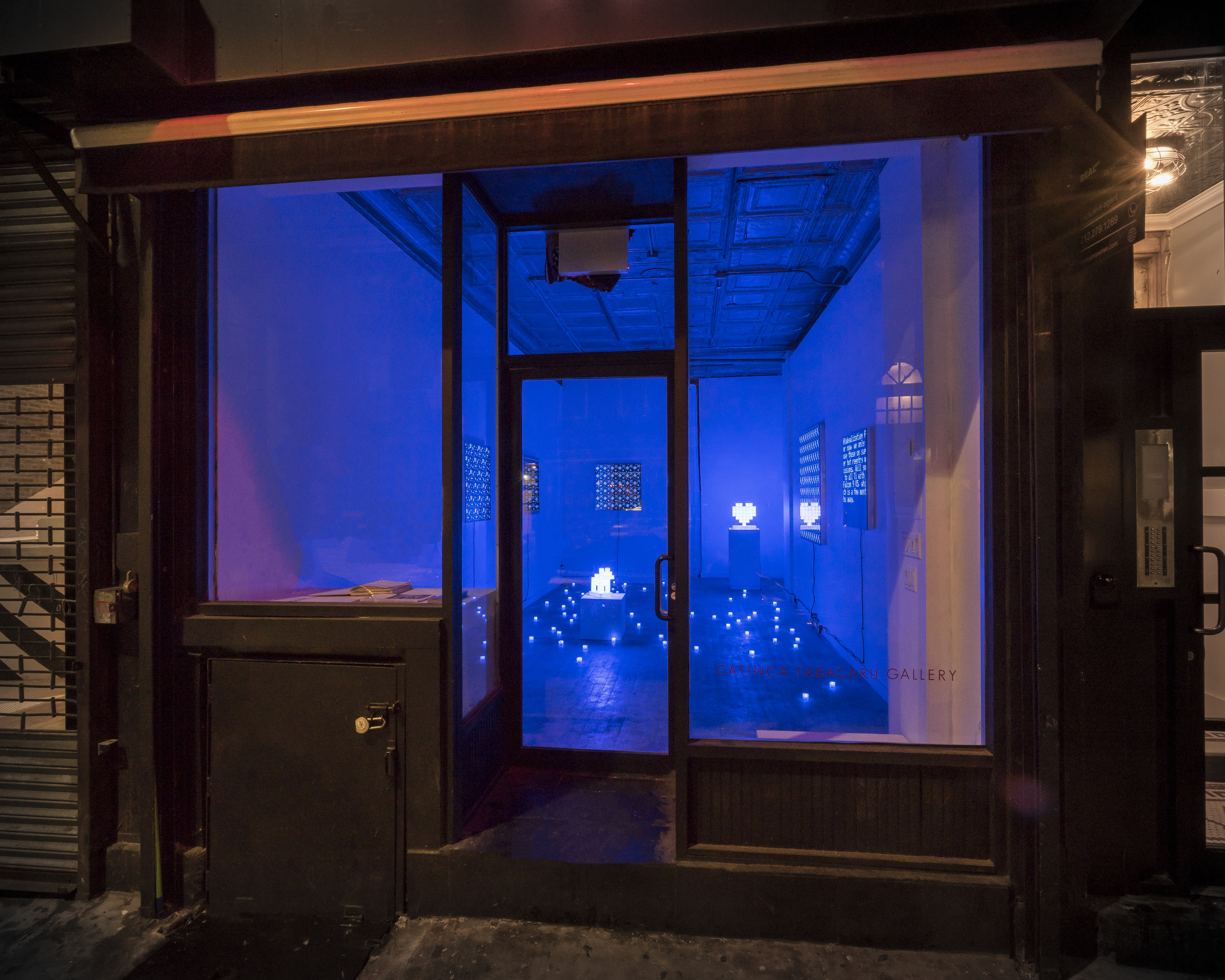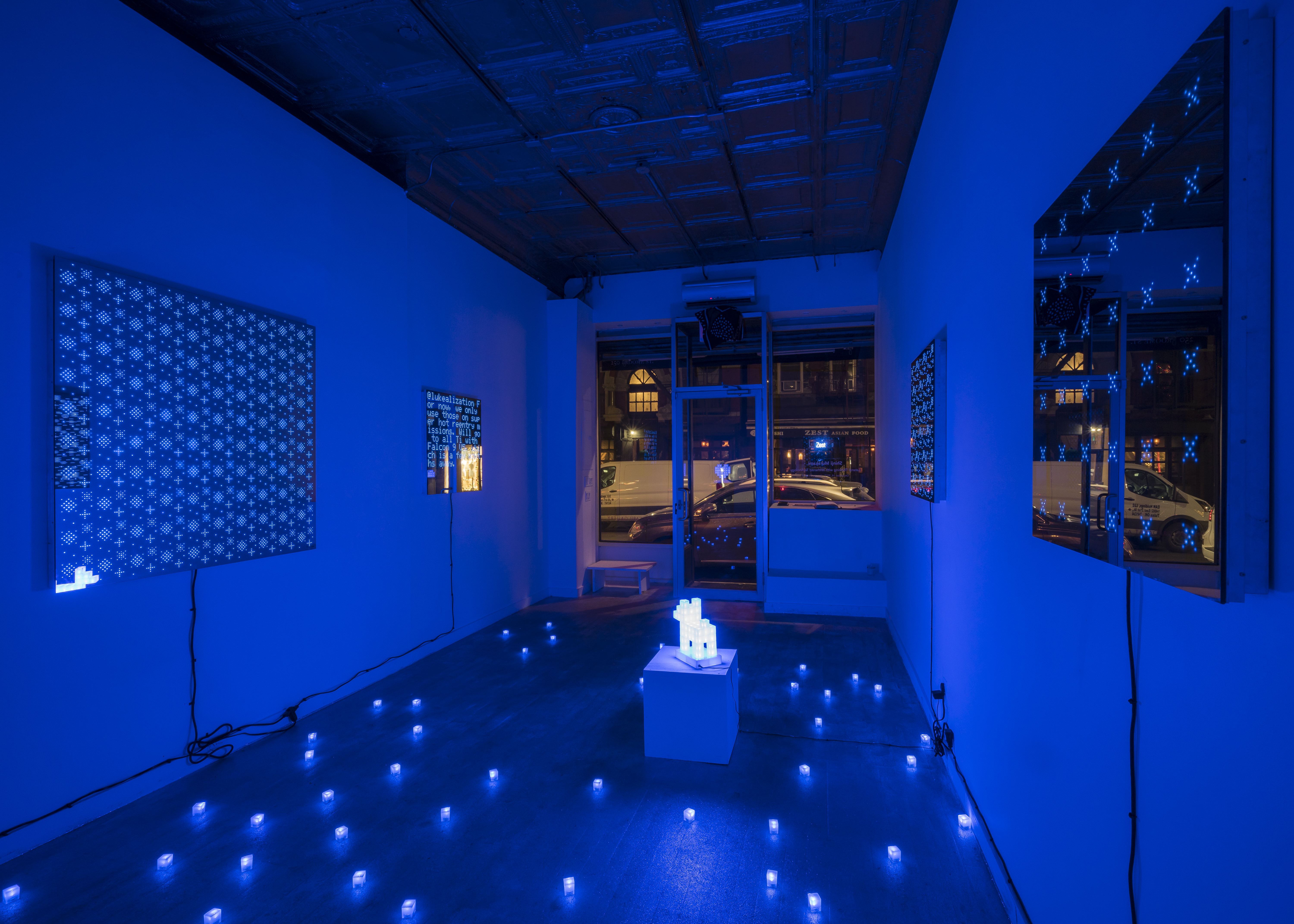 The entire gallery feels like an AR scenario. Littered with several hundred LED cubes, the lights create a space completely removed from the burgeoning Lower East Side of Manhattan. The 1-inch sparkling resin cubes have built-in batteries, unleashed from the constraints of electric power. For Murakami, who began as a scrappy urban artist on the streets of Tokyo in 2002, the cubes act as a new style of street art which the artist has been developing since his arrival in New York City in 2009. Beginning to experiment with light in 2012, he used luminescent paint on cube pieces and placed them in the streets, but found them not bright enough. In 2013 he gathered the chemical liquid in Glow Sticks and tried drawing with it, but ran into a myriad of practical problems as the light source would only last a few hours. It was two years later that he started experimenting with a variety of light-emitting diode lighting (LED), preferring the technology for its customizable qualities and sustainability.