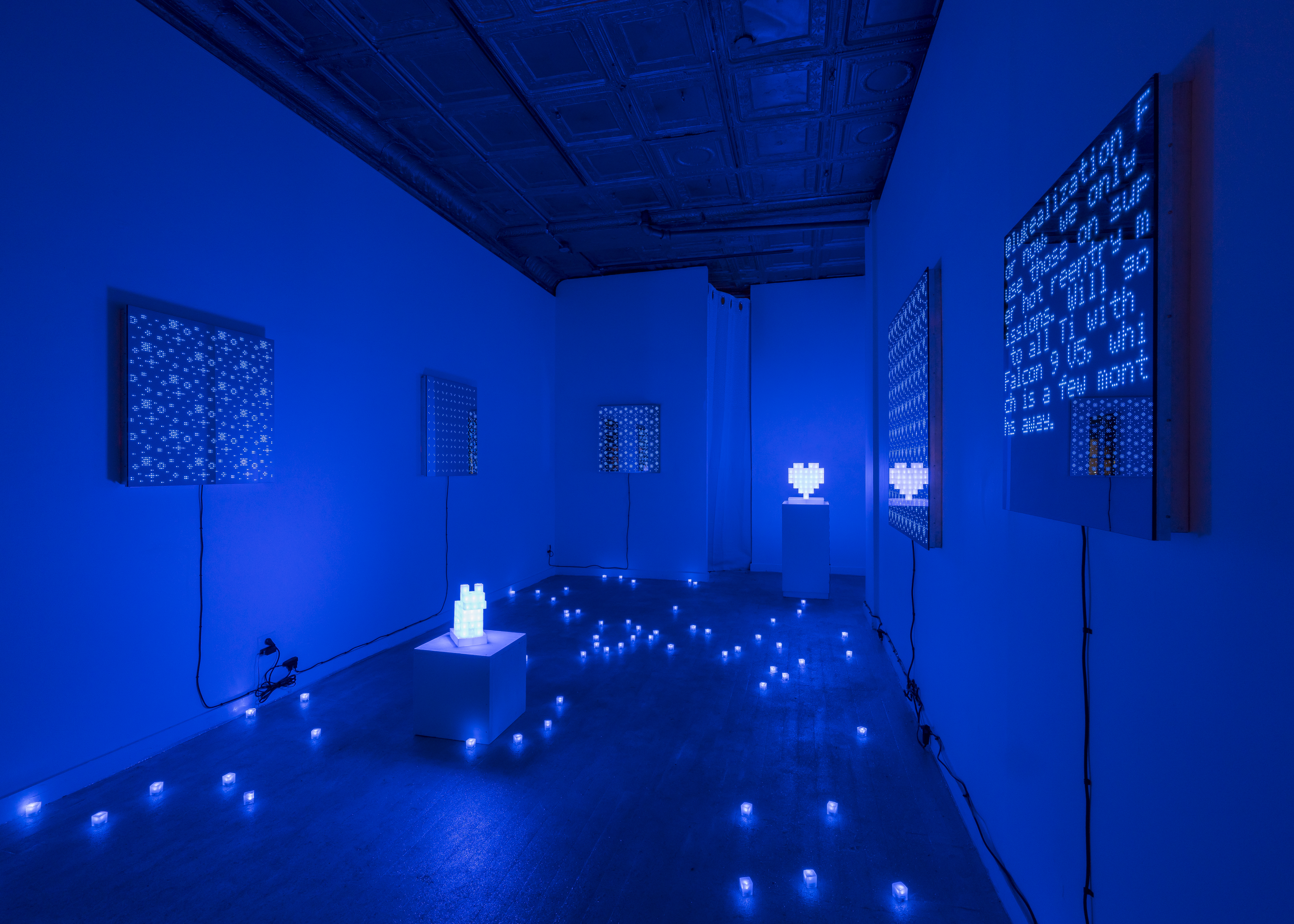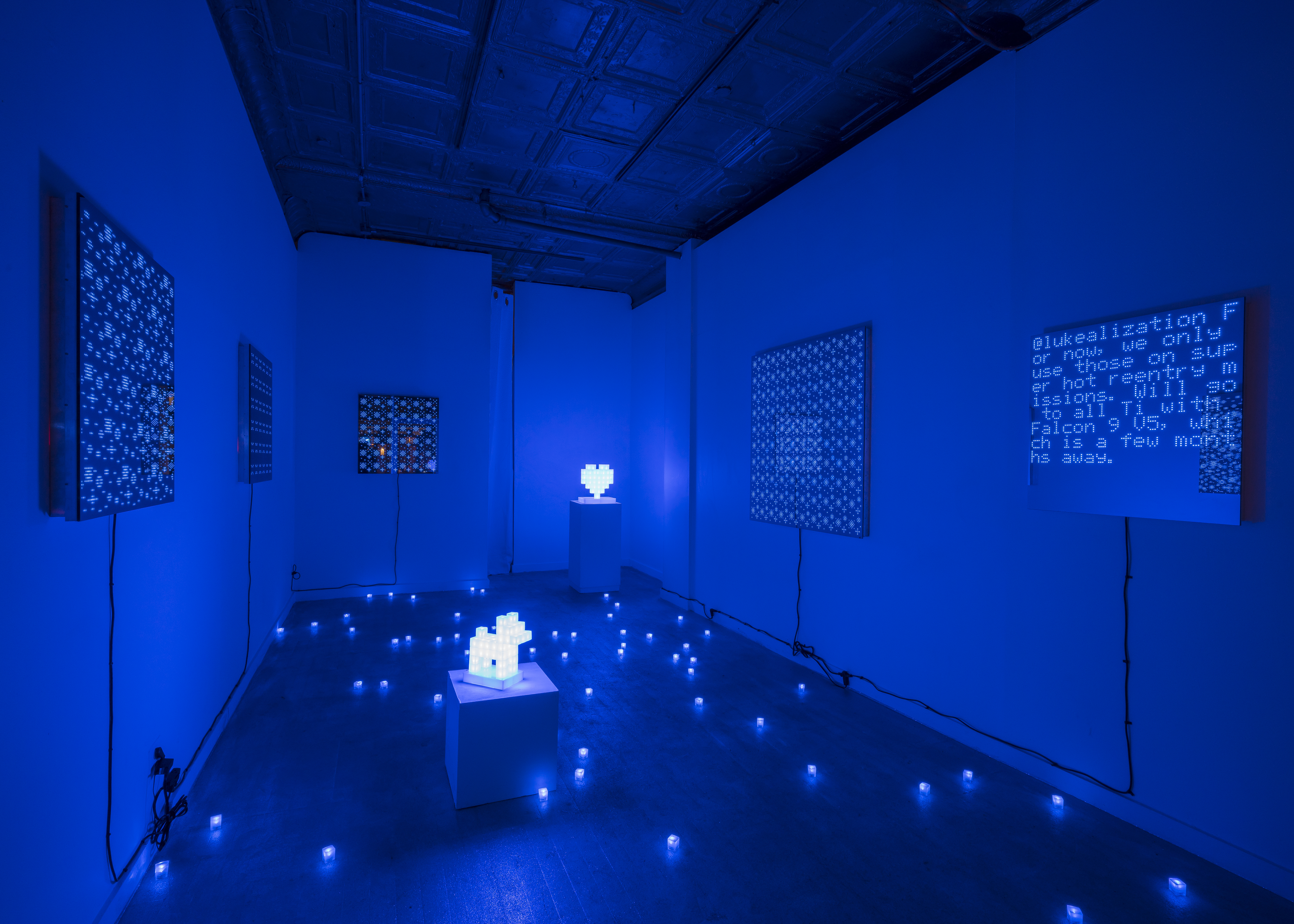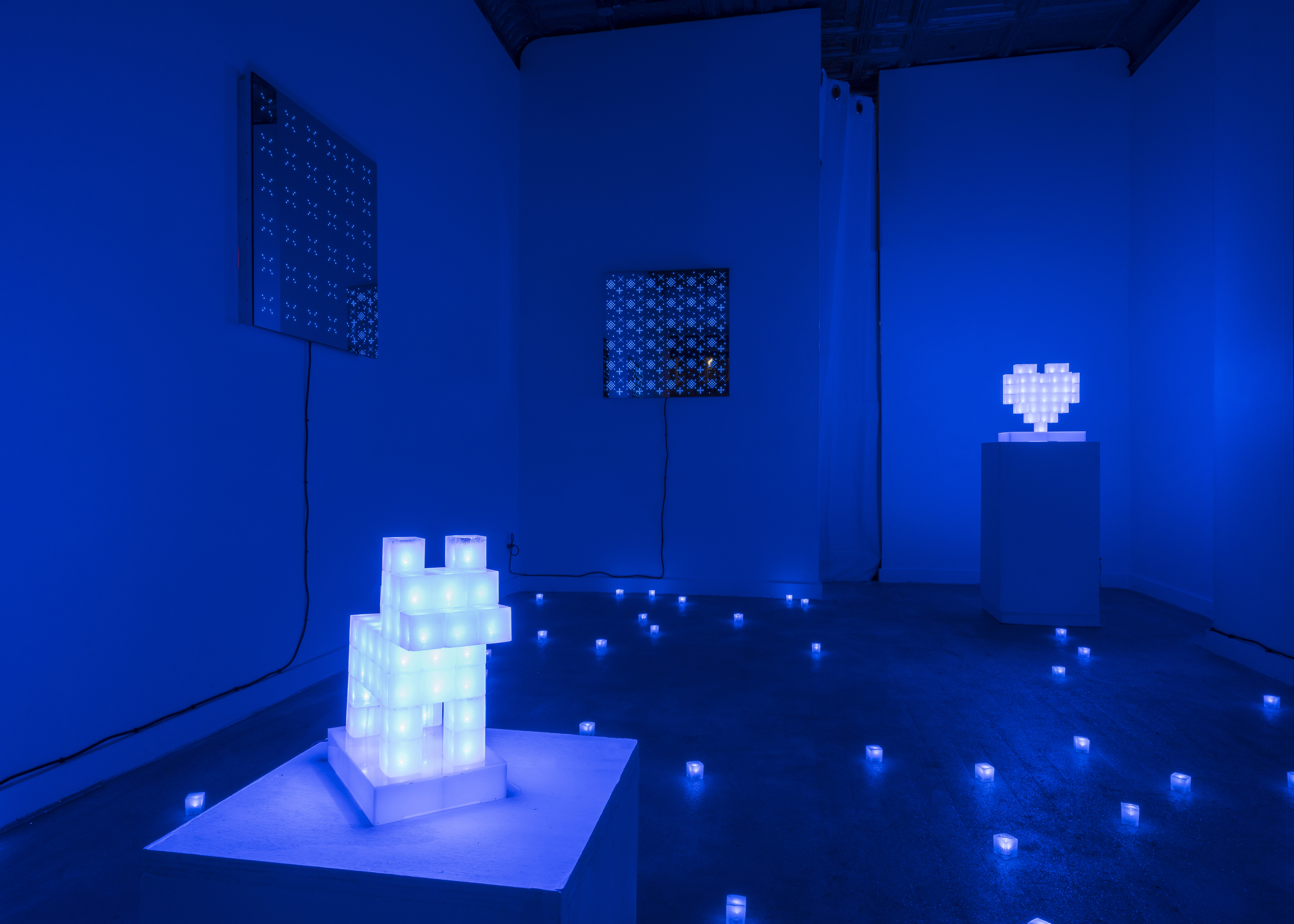 The works in Lateral Thinking with Withered Technology make use of LEDs in a variety of styles and critically engage how the digital world influences many aspects of contemporary culture. In sculpture, the light is built into cubes of clear resin, each serving as an individual pixel. Instead of color emission resulting from light reflection, here, the sculptures emit light themselves, producing a different experience for the retina. Similarly, two-way mirrors bring viewers into the flat works walls as a matrix of pixels march before our eyes. There is a sense of something simultaneously primitive and futuristic floating across a minimalistic space map composed of binary 1's and 0's – digital pixels emerging from the screen to inhabit the real world, a nod to the Augmented Reality (AR) movement propelling the future upon us.
